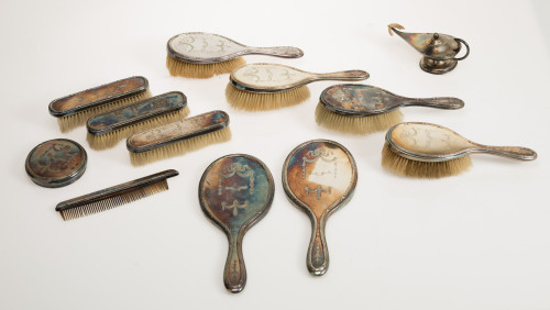 Compuesto por: Cuatro cepillos para el pelo, un peine, dos espejos con el azogue totalmente perdido, tres cepillos para ropa y una tapa.