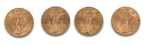 Lote de cuatro monedas en oro amarillo de 21 kt. de 50 pesos mexicanos de 1944, 1945, 1946 y 1947.Peso: 166,44 Gr..