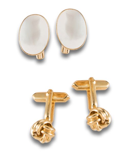 Lote de dos gemelos en metal dorado, uno con placa de nácar y otro con nudo.