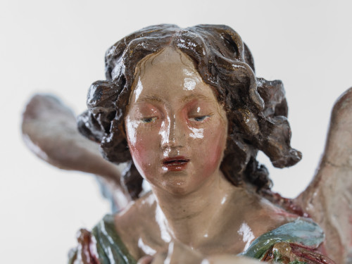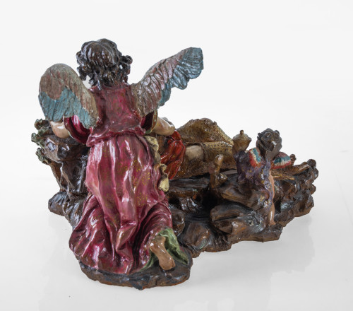 Esta delicada pieza en terracota policromada representando el Éxtasis de santa María Magdalena, pertenece a esta última etapa de su producción, desarrollada en la corte, en la que Luisa Roldán realizó un notable conjunto de grupos devocionales en barro cocido conocidos popularmente como “alhajas”; una nomenclatura que ya se empleó en su época por los rasgos formales de carácter preciosista que caracterizan a este tipo de obras, similares a los de las joyas o adornos. La obra, procedente de una colección particular, fue dada a conocer hace algunos años, cuando fue publicada en la revista Ars Magazine, por el doctor Alfonso Pleguezuelo, quien la puso en relación con el ejemplar que, con el mismo tema, se conserva en la Hispanic Society de Nueva York. Las dos esculturas son similares en su exquisito y pormenorizado tratamiento, pero presentan entre ellas una diferencia evidente: el número de personajes, ya que en el ejemplar americano son dos ángeles mancebos los que asisten a la santa en su tránsito místico, mientras que en éste sólo hay uno; un hecho que obligó a la escultora a modificar ligeramente la posición de algunas figuras.