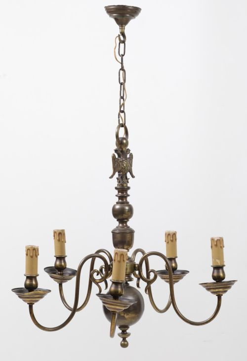 De metal patinado con cinco puntos de luz y rematada en un águila bicefala.