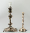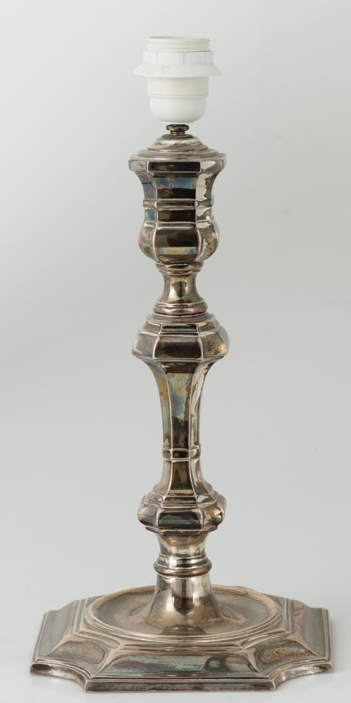 Lámpara de mesa de plata española, ley 916. A partir de un candelero. Con decoración ingletada.