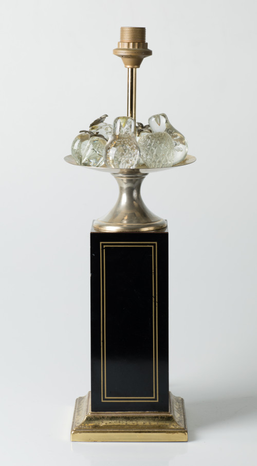 Con base lacada en negro y latón dorado rematado por frutero con frutas. Presenta faltas.