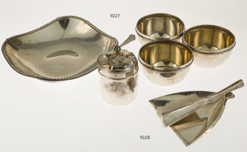 Lote compuesto por azucarero y recogemigas de plata, España, med.S.XX.