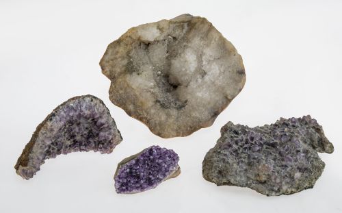 Lote compuesto por tres geodas de amatista y una de cuarzo blanco.