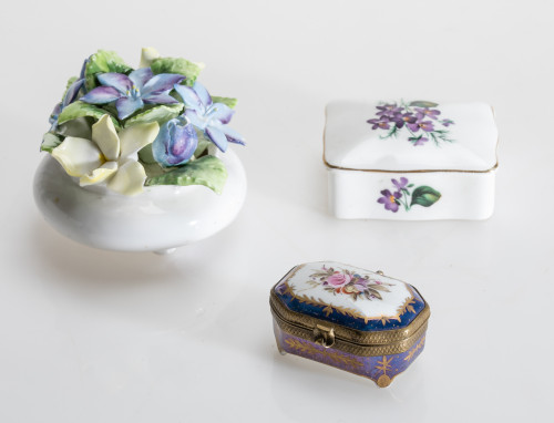 Lote de dos cajitas y un florero de colección de porcelana esmaltada, S.XX. Pequeñas faltas en el florero.