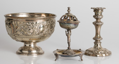 Lote compuesto por candelero en plata Sterling inglesa, punzonada, con decoración de rocalla y volutas de acanto en relieve (Peso: 530 gr0) y frutero en metal plateado, con decoración vegetal (16 x 21 cm.).
