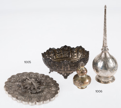 Lote de tres piezas de plata: dos perfumadores en plata oriental y un centrito, con decoración de personajes.