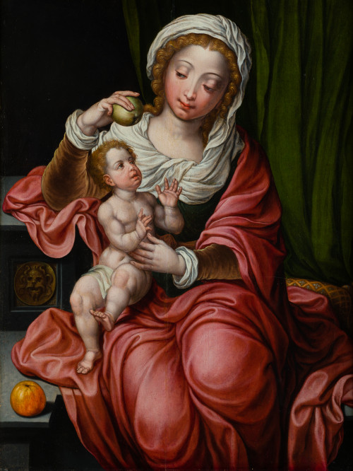 Ambas figuras se encuentran representadas en un primer plano, adquiriendo un importante tono monumental que acentúa la sensación de cercanía física con el espectador; un efecto que se potencia todavía más con la sobriedad del elegante fondo neutro, en el que destaca un cortinaje verde que se complementa con el rojo del manto de la Virgen.