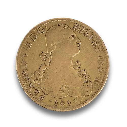 Moneda de 8 escudos en oro amarillo de 21 kt. de Fernando VII de 1818 de la ceca del Nuevo Reino de Granada (Colombia). Peso: 26,85 Gr..