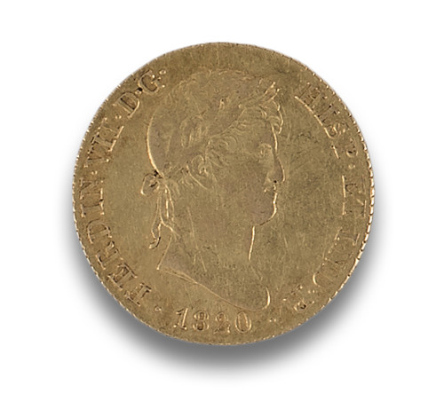 Moneda de oro de 4 escudos de Fernando VII, 1820.Peso: 13,52 Gr..