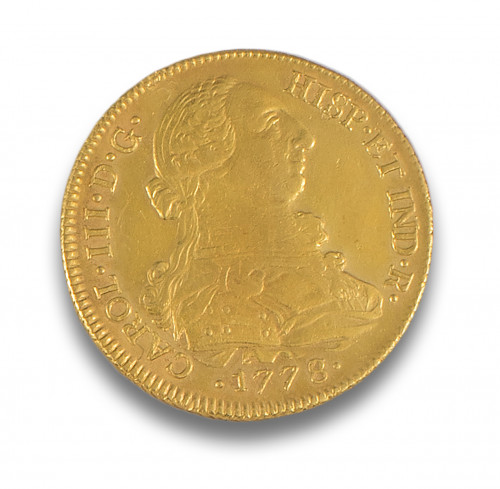 Moneda de oro PELUCONA, 8 escudos Carlos III, de 1778.Peso: 26,80 gr