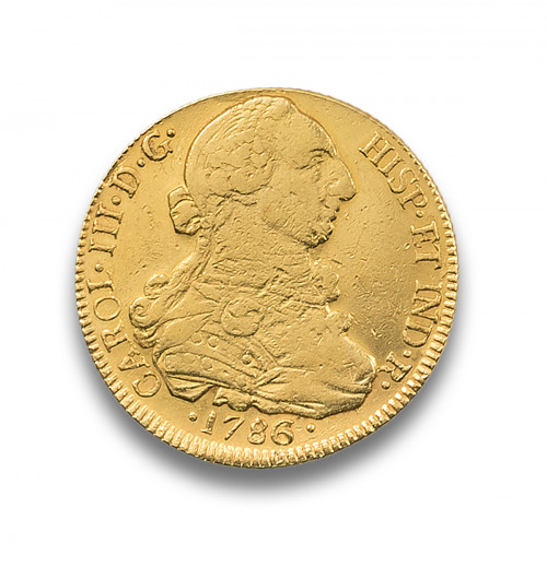 Moneda de oro PELUCONA, 8 escudos Carlos III, de 1786.Peso: 25 gr