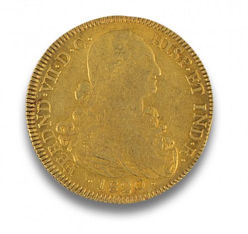 Moneda de oro PELUCONA, Ocho escudos Fernando VII, de 1820.