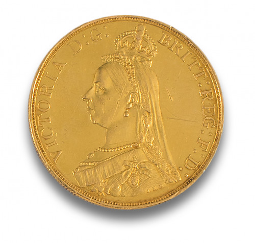 Moneda de oro de la Reina Victoria de Inglaterra, de 1887.Peso: 39,50 gr
