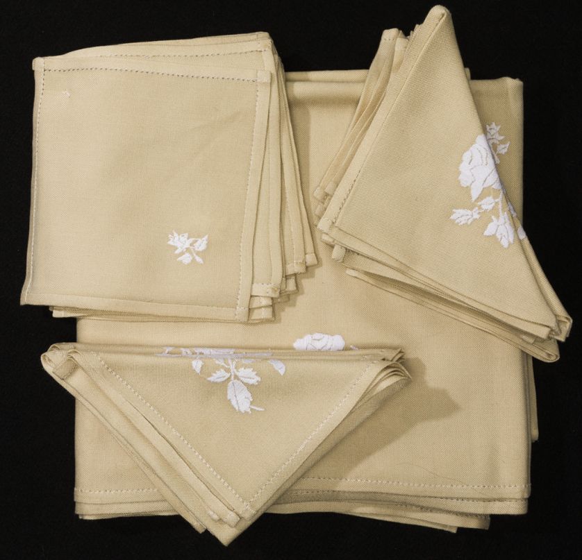 Manteleria de color beige con flores bordadas en blanco. Con doce servilletas de merienda y doce de té.