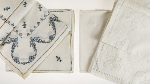 Mantelería en lino blanco de Lagartera, con bordado de grecas y guirnaldas florales. 12 servilletas.