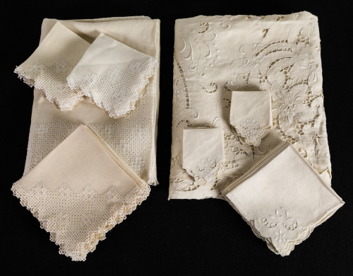 Mantelería en hilo crudo con bordado calado tipo Lagartera. Con 12 servilletas de mesa y 12 de merienda.