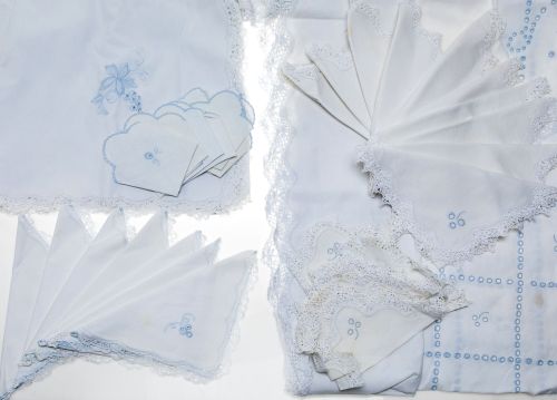 Mantelería en hilo blanco con bordado en azul formando bandas, y encaje de bolillos. Con doce servilletas de mesa y doce de merienda. Medidas: 270 x 160 cm.
