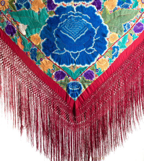 Mantón chino de los llamados de Manila, en seda roja con decoración floral bordada en rica policromía. Ancho fleco trenzado. Añgún pequeño desgaste.