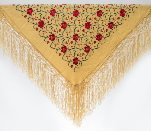De seda amarilla con entrelazos florales bordados en policromía y flecos trenzados.