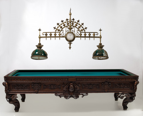 Mesa de billar, Camilo Laorga, España, 1878. Con decoración tallada de estilo alfonsino, firmada y fechada. Inscripción en la placa del contador "R. Laorga Vega hermanos. Madrid". Pequeñas faltas y alguna pieza desencolada. Adjunta bolas de billar.