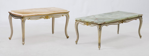 De madera lacada en blanco y parcialmente dorada con tapa de ónix verde.