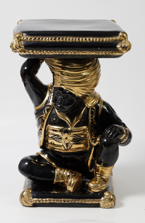 Mesita de loza esmaltada y dorada con pie en forma de moro.