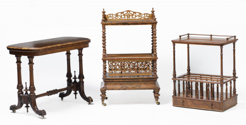 Musiquero de madera de raíz, pps. S. XX. Con galería y faldón calado, patas torneadas y cajón disimulado en la cintura. Precisa restauración.