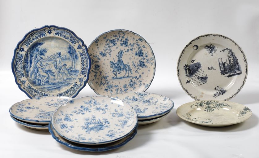 Ocho platos de cerámica esmaltada, manufactura Cases, S. XX. Con decoración de diferentes escenas en azul siguiendo modelos del S. XVIII.