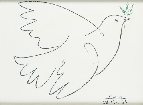 Firmada y fechada en plancha 28.12.61. En la trasera sello “ Editions combat pour la paix, copyright S.P.A,D.E.M. Paris". Utilizada para el poster "Congres national du mouvement de la paix, 10 et 11 mars 1962, Issy les Moulineaux ». Reproducida en : "Picasso, 145 dessins pour la presse et les organisations démocratiques", l’humanité, p. 70 y Czwiklitzer, nº 179
