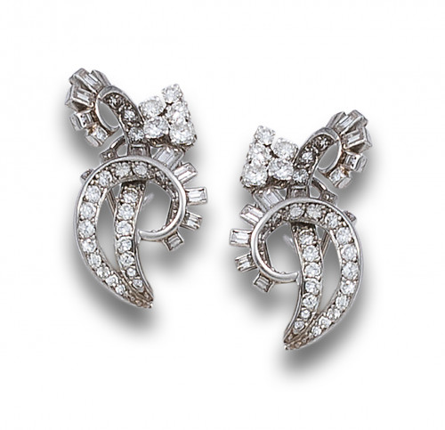 Pendientes, años 50, firmados RETCIGNAC, CARACAS, de platino. Formas vegetales de diamantes, talla brillante y baguette, peso total estimado de 1.40 ct. Sistema de cierre omega.