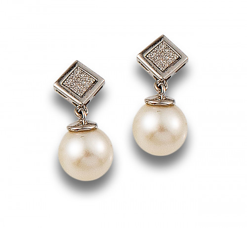 Pendientes colgantes de oro blanco de 18 kt. Formados por un cuadrado de brillantes del que pende una perla australiana de 10 mm. de diámetro.