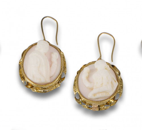 Pendientes colgantes de oro amarillo de 18 kt. formados por centros de cabujones tallados de coral piel de ángel, con busto femenino y masculino.