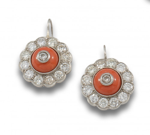 Pendientes colgantes, estilo antiguo, de platino. Formados por una roseta de cabujón de coral central acompañado de diamantes, talla brillante.