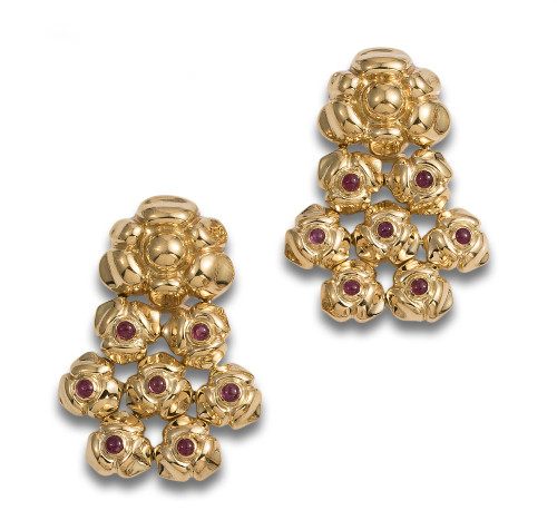 Pendientes largos de oro amarillo de 18 kt. Diseño floral con centro de cabujones de rubíes, engastados en chatón. Sistema de cierre omega. Peso: 35,60 Gr..