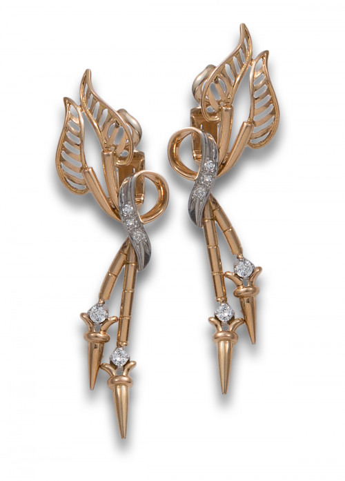 Pendientes largos, años 40, de oro amarillo de 18 kt. con vistas en platino. Diseño calado con detalles de diamantes, talla brillante y 8/8, engastados en garras. Sistema de cierre omega.