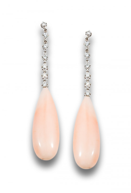 PENDIENTES LARGOS DE DIAMANTES Y CORAL PIEL DE ÁNGEL, EN OR