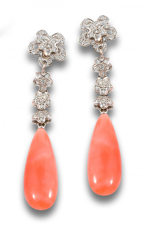 Pendientes largos de oro blanco de 18 kt. formados por flores de diamantes, talla brillante, peso total estimado de 0.80 ct. de las que pende lágrimas de coral rosa.