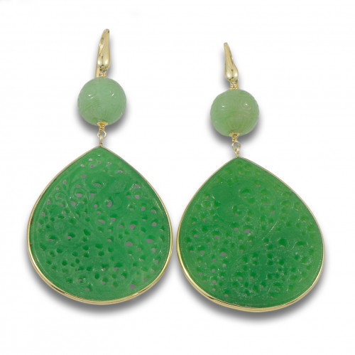 Pendientes largos de jade labrado, con detalles en plata dorada.