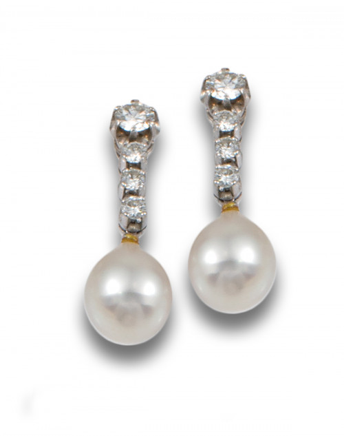 Pendientes largos de platino, formados por riviere de diamantes, talla brillante, peso total estimado de 1.60 ct. dispuestos en degradé, engastados en garras de los que pende una perla australiana, tipo pera calibrada en 14 x 12 mm.  Sistema de cierre de presión (falta una)