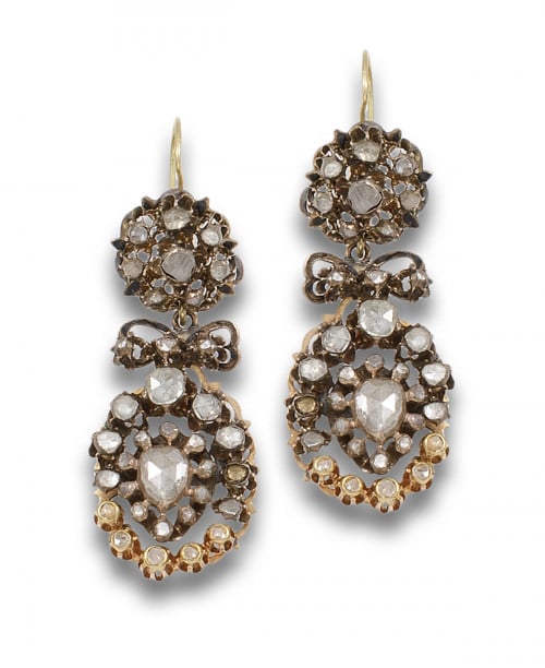 Pendientes largos populares, S. XIX, de oro amarillo y vistas en plata (parte inferior remodelada en uno de ellos). Formados por elementos cuajados de diamantes, talla holandesa y rosa (faltan dos).