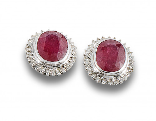 Pendientes rosetones de oro blanco de 18 kt. formados por un rubí central talla oval y orla de diamantes talla brillante.