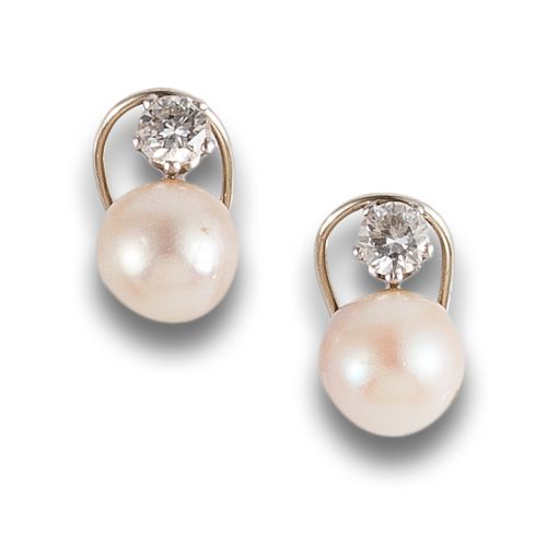 Pendientes tú y yo de oro blanco de 18 kt. Formados por diamantes, talla brillante, peso total estimado de 0.90 ct. engastados en garras y perlas cultivadas calibradas en 10,5 mm. de diámetro. Sistema de cierre omega.