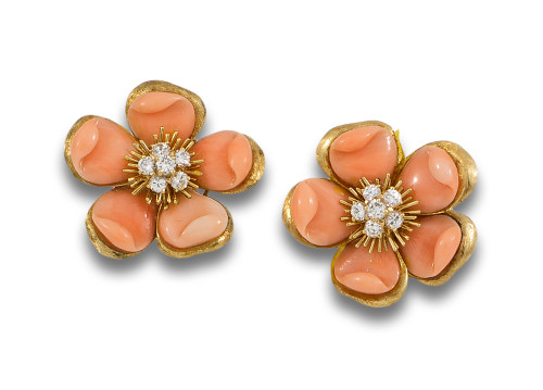 Pendientes VAN CLEEF & ARPELS en forma de flor, realizados en oro amarillo de 18 kt. y coral con centros de diamantes, talla brillante, con un peso total estimado en 0.80 ct. Ref. 119246.