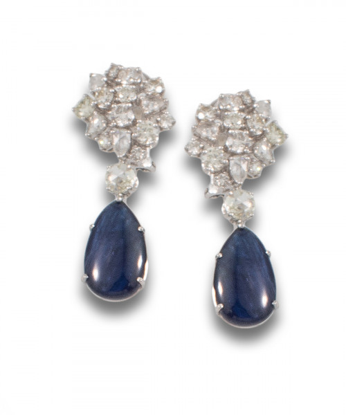 Pendientes largos de oro blanco de 18 kt. formados por cascada de diamantes, talla brillante, perilla y rosa, peso total estimado 4 ct. de la que pende un zafiro Burma natural, talla cabujón, peso estimado de 16 ct.