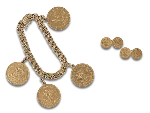 Pulsera, años 60, barbada de oro amarillo de 18 kt. Con cuatro monedas de 20 pesos mexicanos. Gemelos dobles de 2 pesos mexicanos. Peso: 109 Gr..