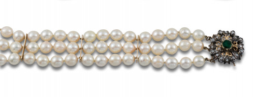 Pulsera de tres hilos de perlas cultivadas de 7.5 mm. de diámetro, entrepiezas de oro y cierre rosetón S. XIX de oro amarillo de 18 kt. y vistas en plata con diamantes y esmeralda, talla brillante.