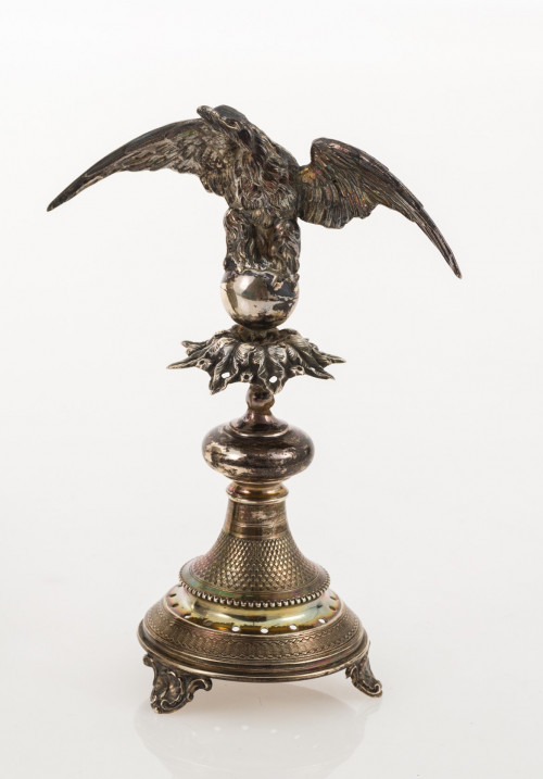 Palillero en plata portuguesa. Base circular guilloché y remate de águila.
