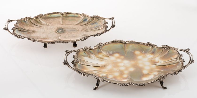 Pareja de bandejas de plata,de perfil oval, con asas laterales y decoración vegetal al borde. Medidas: 44 x 28 cm. Peso: 1.705 gr.